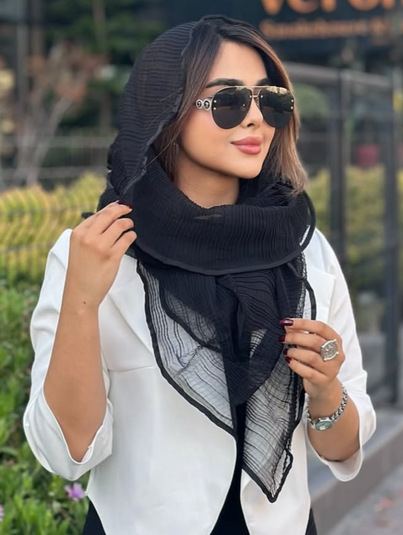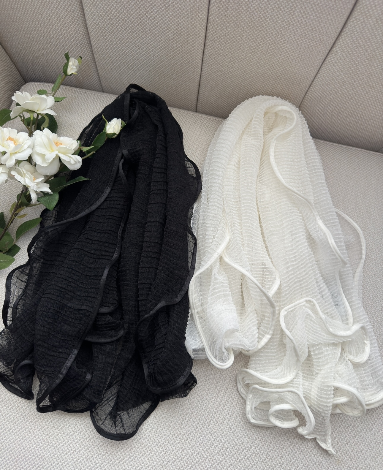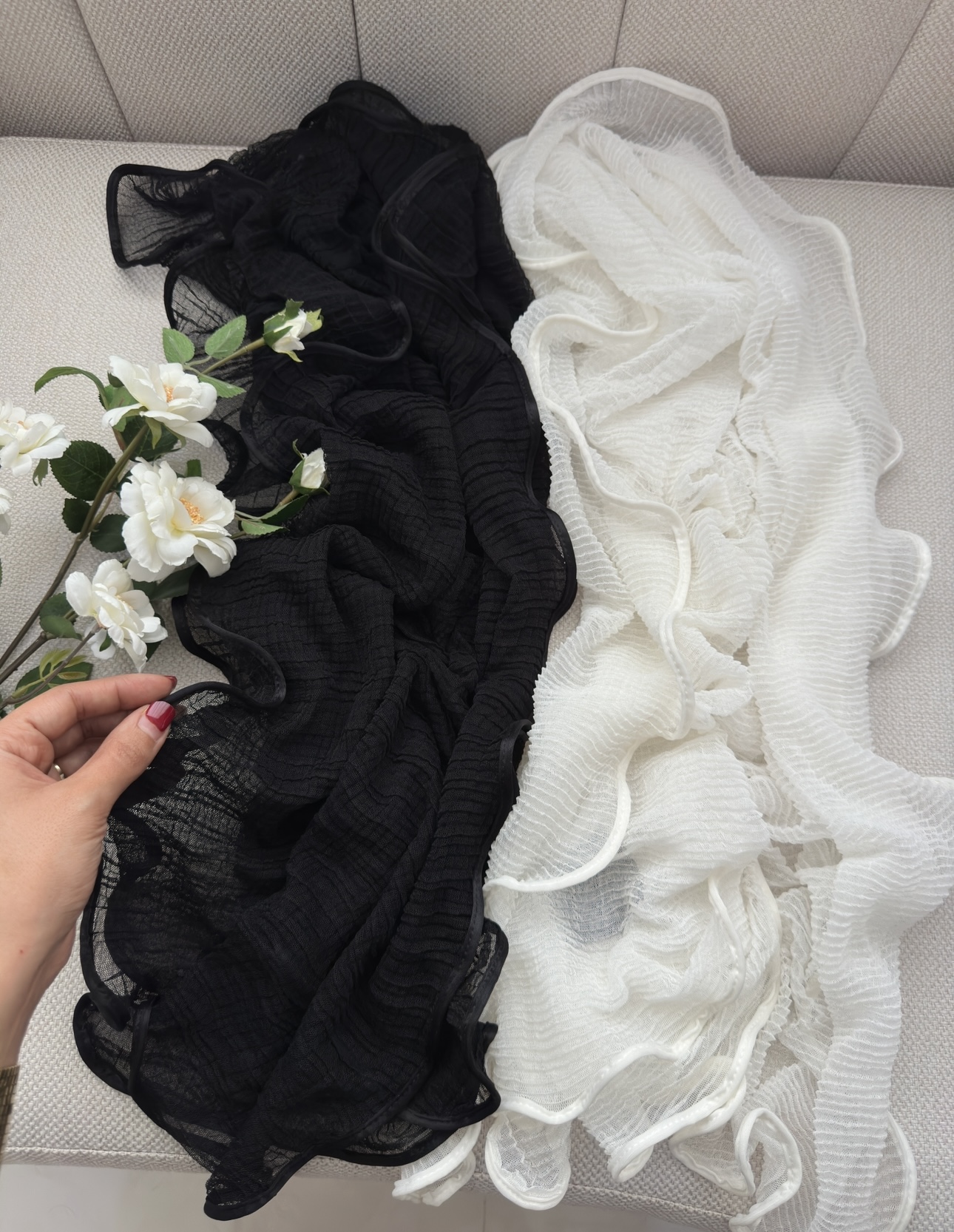 شال پلیسه عروسکی لبه شال نواردوزی شده قواره حدودی ۷۰ در ۱۹۰ رنگ سفید و مشکی قیمت ویژه و اقتصادی مناسب مجالس و مهمانی و روزمره